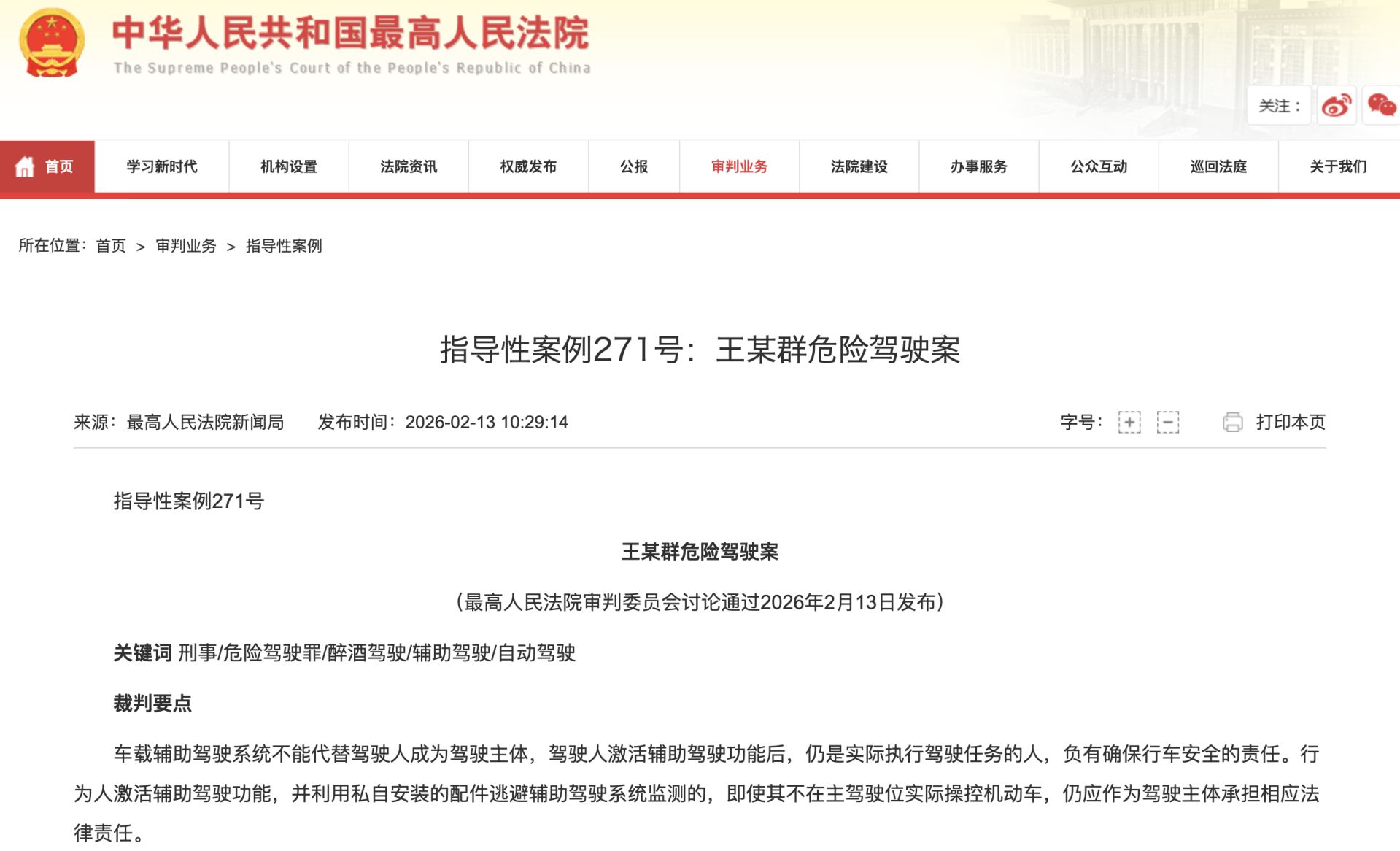 2月13日,最高人民法院发布第48批指导性案例(268–272号),这是最高法首次发布道路交通安全刑事专题指导性案例。